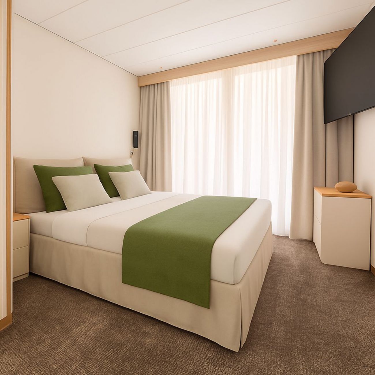 Каютите са с площ около 12 кв. м. и са оборудвани с климатик, телевизор, вътрешен телефон. На средна и горна палуба са с френски плъзгащи се прозорци, които се отварят.