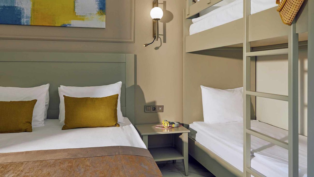Хотелът разполага с общо 594 стаи, разположени в 20 дву и три-етажни къщички, от които 370 стандартни стаи Standard room (24 м2), 126 стандартни стаи с двуетажно легло Standard Room with Bunk Bed (24 м2), 92 фамилни стаи Family room (2 спални, 1 баня - 46 м2). Всички стаи са оборудвани с климатик, телевизор, телефон, баня с душ/вана, сешоар, чехли, минибар (вода, бира, безалкохолни напитки - безплатно), сейф (безплатен). Почистване на стаите - всеки ден, смяна на спално бельо и кърпи – 3 пъти в седмицата.