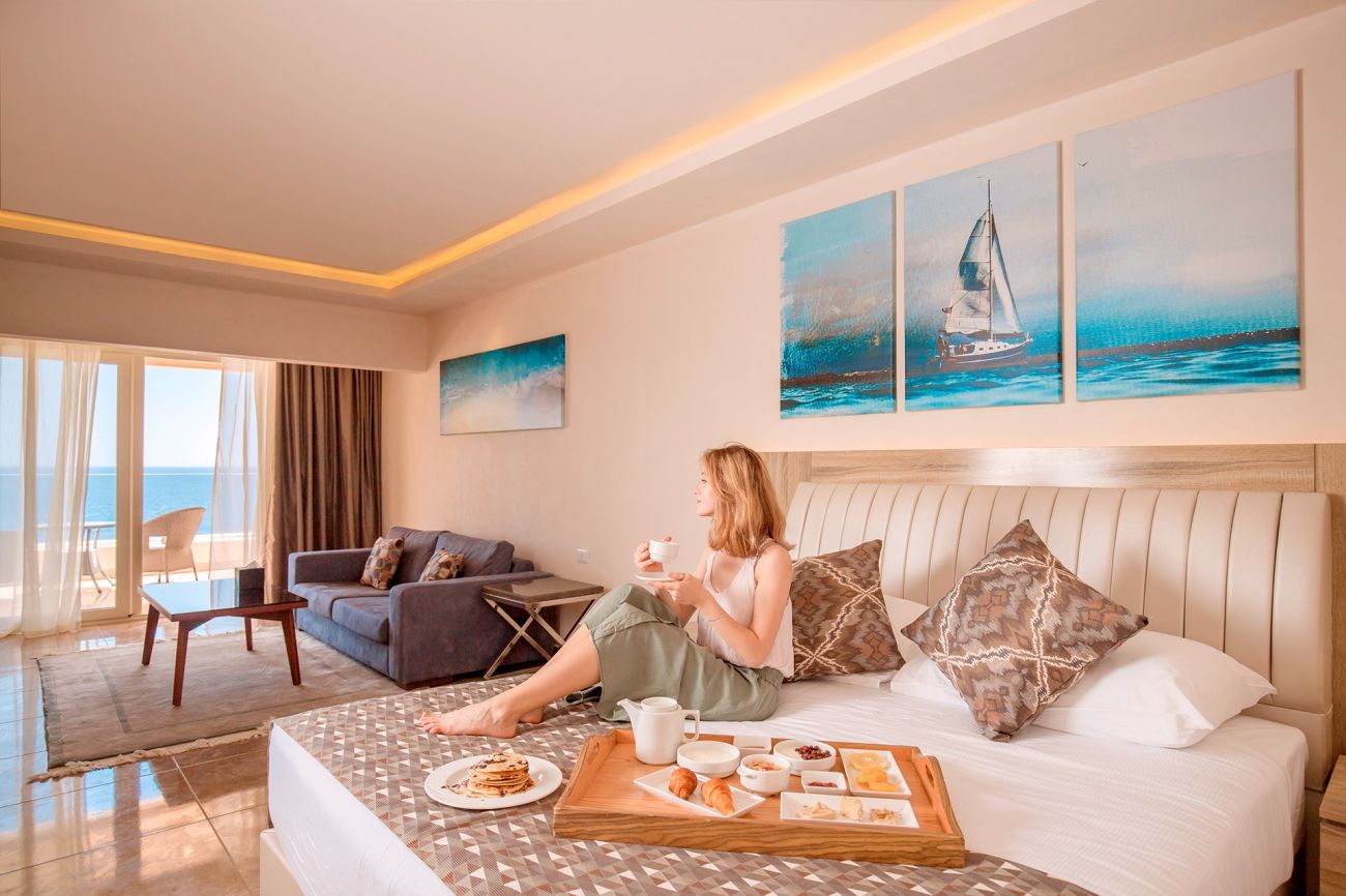 Хотелът разполага с общо 550 стаи, разположени в 1 основна четириетажна сграда, и комплекс от дву- и четириетажни корпуси: Standart rooms (с изглед към морето – 57-64 м2), Deluxe rooms (с изглед към морето – 70 м2), Family rooms (2 спални, с изглед към морето 70 м2). Всички стаи са оборудвани с климатик, телевизор, телефон, баня с душ, сешоар, сет за чай/кафе, минибар (зарежда се с вода и безалкохолни напитки - безплатно), сейф, балкон, Wi-fi. Почистване на стаите и смяна на кърпи - всеки ден, смяна на спално бельо - 2 пъти седмично.