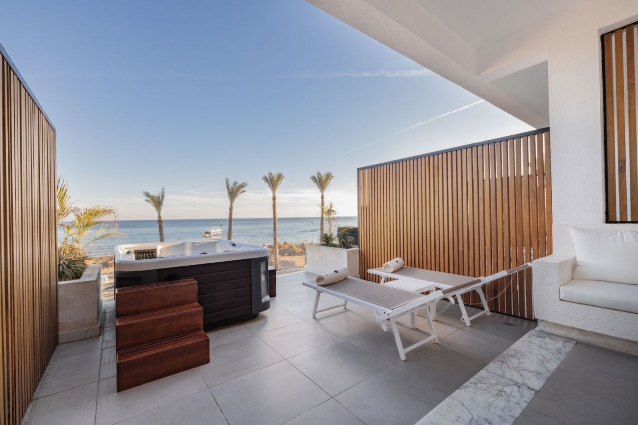 Собствен, пясъчен. Чадъри, шезлонги, матраци и плажни кърпи на плажа и при басейна - безплатно.