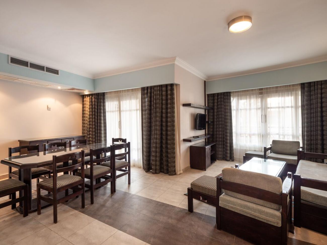 Хотелът разполага с общо 192 апартаменти, разположени двуетажни и триетажни корпуса, от които 106 One Bedroom Apartment (75 m2), 76 Two Bedroom Apartment (90 m2), 10 Duplex Villa. Всички стаи са оборудвани с климатик, телевизор, телефон, баня с душ, сешоар, минибар (зарежда се всеки ден с минерална вода - безплатно), сет за чай/кафе, сейф, балкон, WI-fi (срещу заплащане). Почистване на стаите и смяна на кърпите - всеки ден.