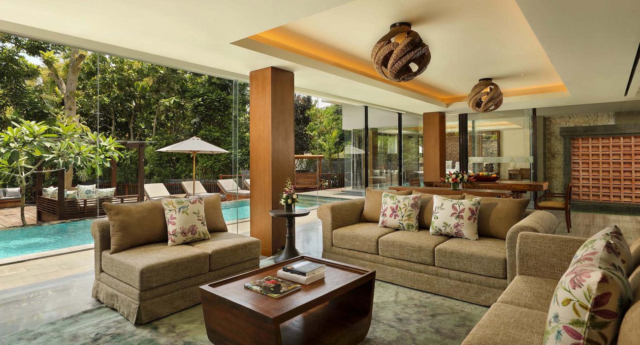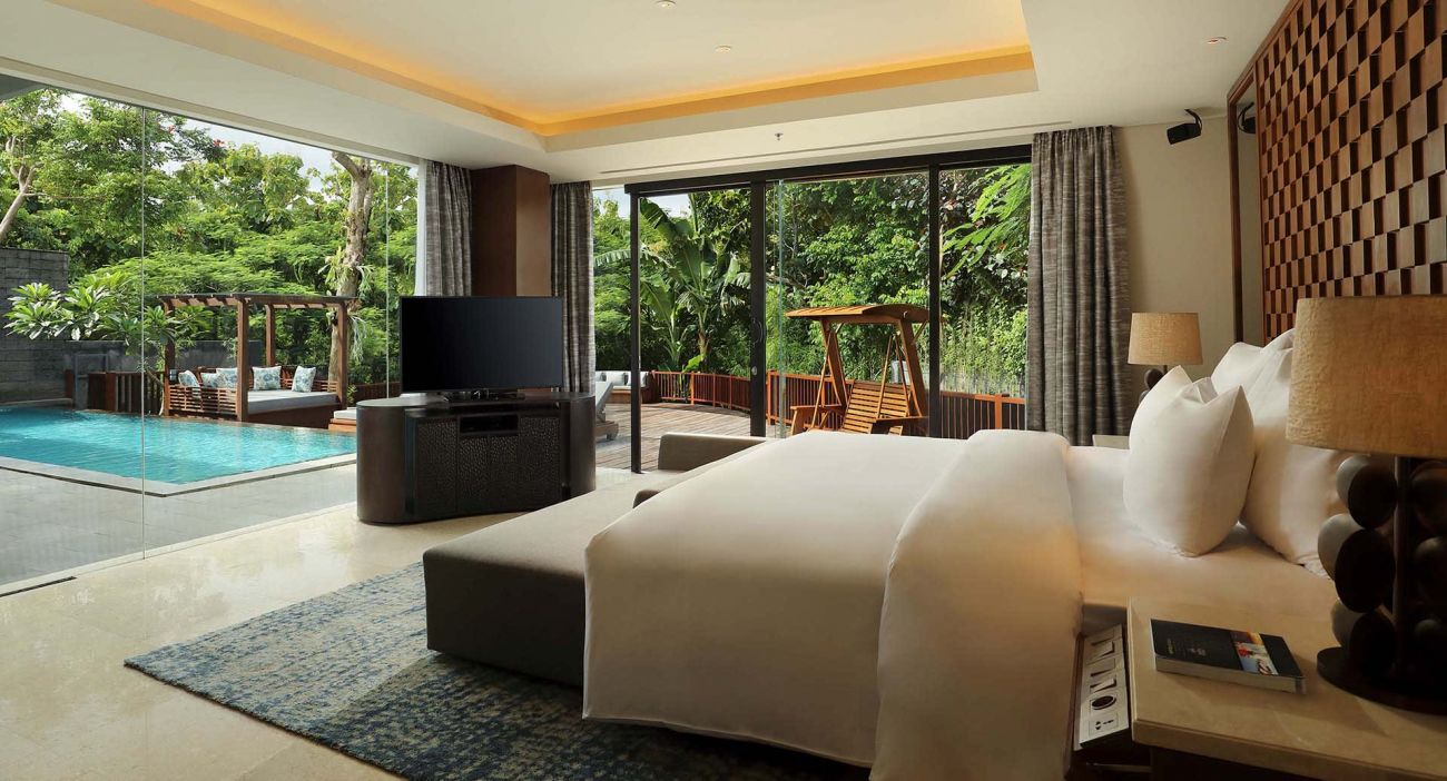 - Three Bedroom Garden Pool Villa – 577кв. м. и максимален капацитет 6 възрастни и 1 дете; собствен двор с външен басейн и кът за отдих