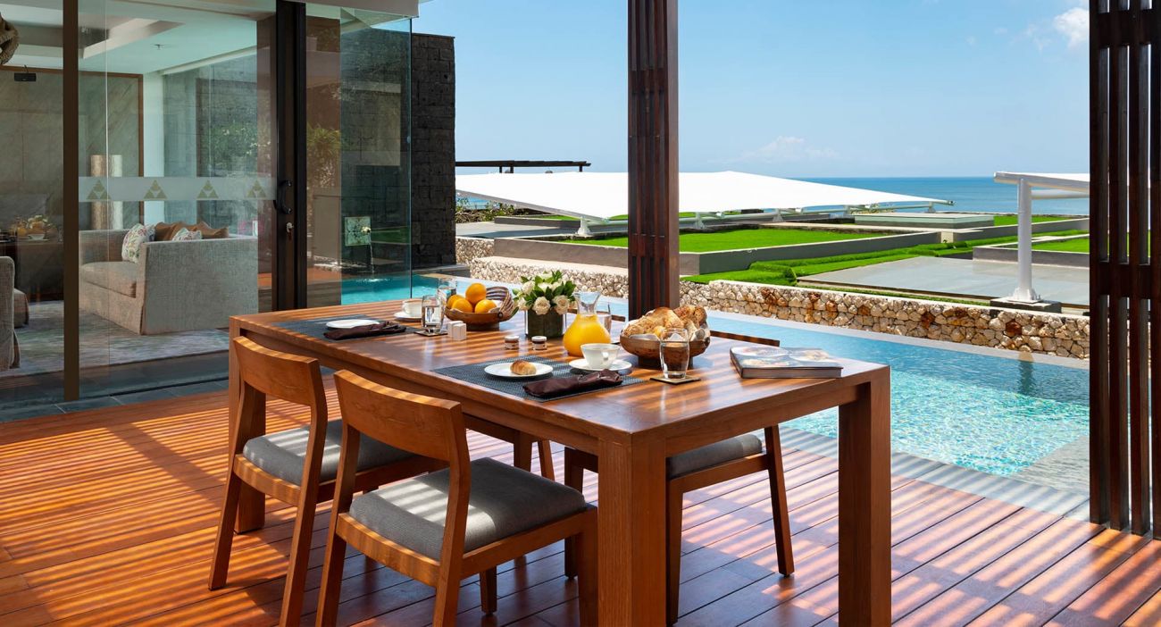 - Three Bedroom Ocean View Pool Villa – 330кв. м. и максимален капацитет 6 възрастни и 1 дете; собствен басейн и външна тераса с кът за отдих с гледка към океана