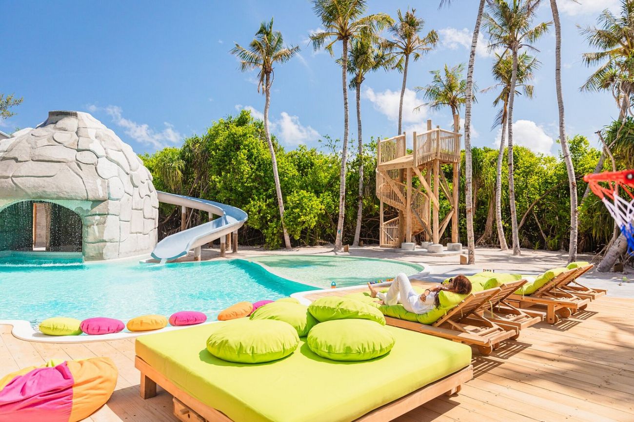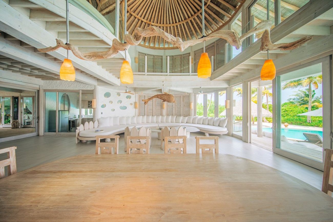 • 1 Four Bedroom Water Retreat with Slid (1291 кв.м) е вила на два нива в северната част на острова. На партерния етаж - две спални с двойно легло, офис, съблекалня, 2 бани, парна баня, сауна, хол с трапезария, тераса с водна пързалка, с басейн със солена вода и хамаци над водата, шезлонги и спускане в океана. На втория етаж има спалня с двойно легло, детска спалня, фитнес зала, баня с душ. Максималното настаняване е 10 възрастни или 8 възрастни и 6 деца.