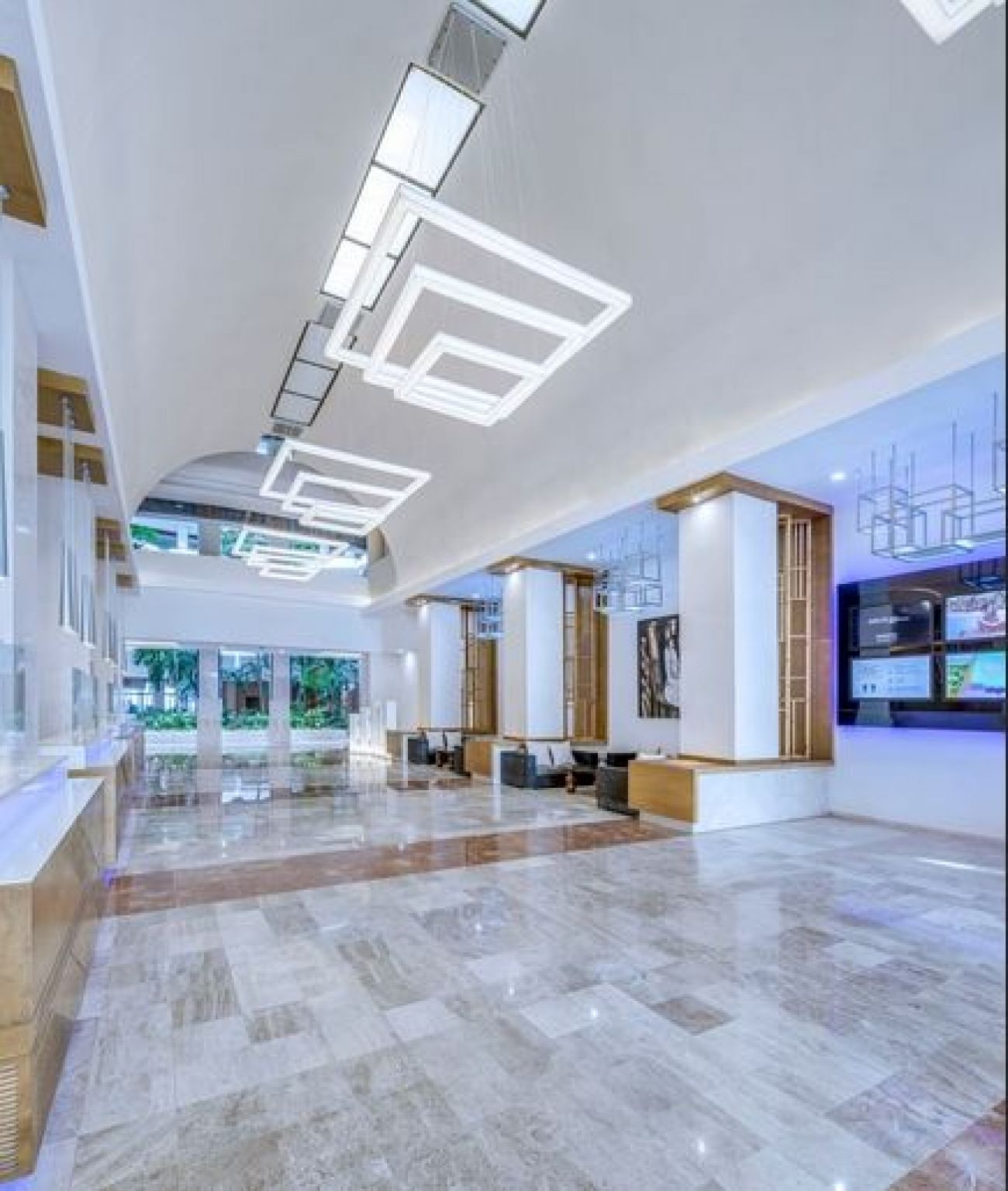 Кръгло фоайе с естествена светлина и 3 панорамни асансьора с изглед към изкуствена лагуна и красиви градини правят този 5-звезден ол инклузив курорт в рамките на Las Américas Resort още по-привлекателен. Той също така разполага с удобни стаи, изключителен етаж с услуги на The Level, разнообразни заведения за хранене и специална програма за голфъри, пътуващи със семействата си.