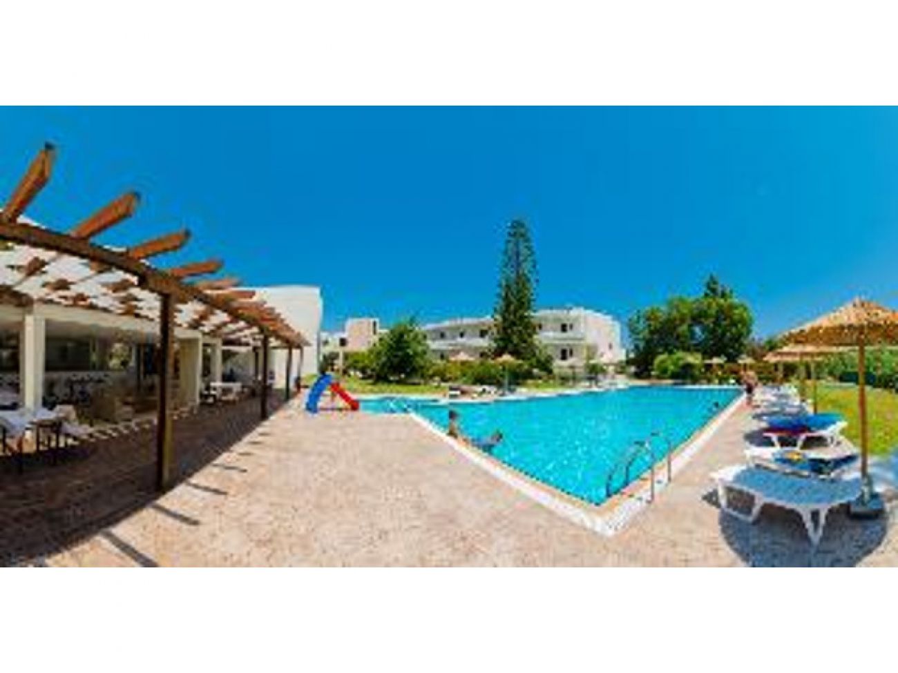 - Басейн с шезлонги и чадъри