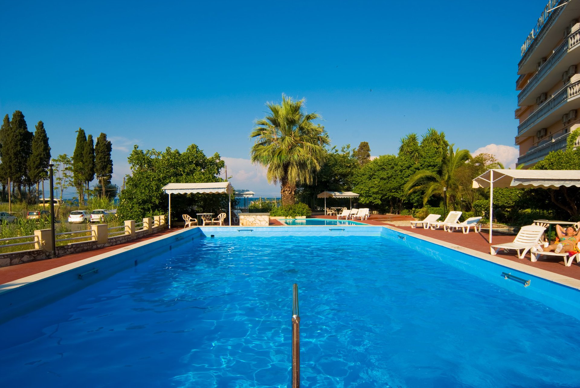 - Шезлонги и чадъри на басейна