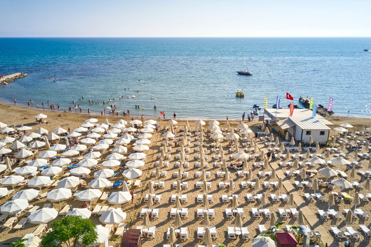 Собствен, пясъчен, със сертификат Син флаг. Чадъри, шезлонги и матраци на плажа и при басейна - безплатно.