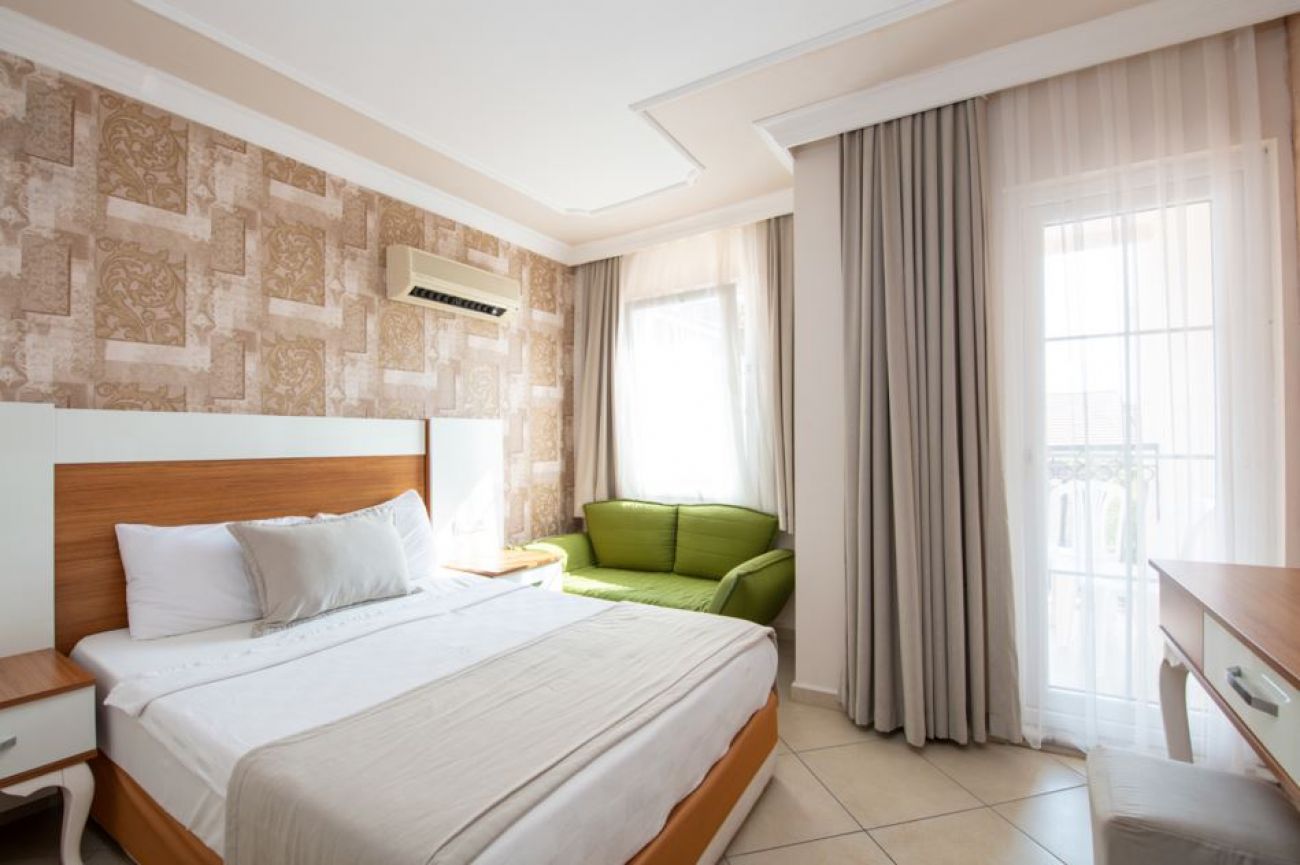 Хотелът се състои от 7 блока на по 3 етажа и разполага с общо 132 помщения за настаняване - стандартни стаи (с гледка море или градина) и фамилни стаи. Всички те са оборудвани с климатик, телевизор, телефон, минибар (заредежда се в деня на настаняване с минерална вода и безалкохолни напитки). Следващите дни се допълва само с минерална вода), сейф, баня с душ кабина, сешоар, балкон. Почистване на стаите - всеки ден, смяна на бельото - два пъти в седмицата.