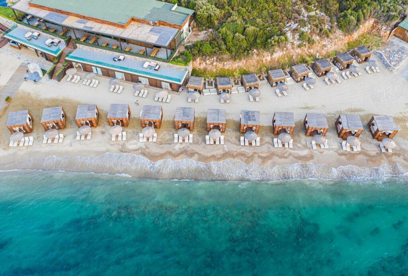 Собствен плаж с бял пясък и дължина от 650 метра, две платформи, 100 метра VIP пясъчен плаж с VIP платформа и Син флаг.