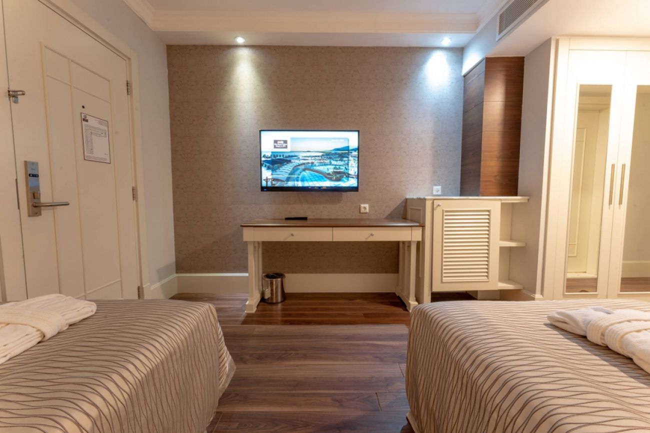 Хотелът разполага с 470 стаи, от които 406 Standard room (с изглед градина, частичен изглед море и изглед море - 29 m²), 50 Family suite (40 с изглед море, 2 спални, 1 баня - 36 m²: 10 с изглед градина, 2 спални, 1 баня - 42 m² ), 9 Royal deluxe suite (с изглед море, 1 спалня, 1 всекидневна, 2 бани - 69 m² ), 4 Laguna suite (с изглед море, 2 спални, 1 всекидневна, 2 бани - 86 m²), 1 Presidental suite (с изглед море, 2 спални, 1 всекидневна, 2 бани, сауна, джакузи - 165m²) и 5 Handicapped (пригодени за хора с ограничена подвижност - 29 m²). Всички стаи са оборудвани с климатик, телевизор, телефон, баня с душ, сешоар, сет за чай/кафе, минибар (ежедневно зареждане с безалкохолни напитки, бира, вода и специално мляко Nesquik за семейства с деца - безплатно), сейф (безплатен), балкон, Wi-Fi интернет. Икономичните стаи са на приземен етаж без балкон. Почистване на стаите и смяна на кърпите - всеки ден, смяна на спалното бельо - 3 пъти в седмицата.