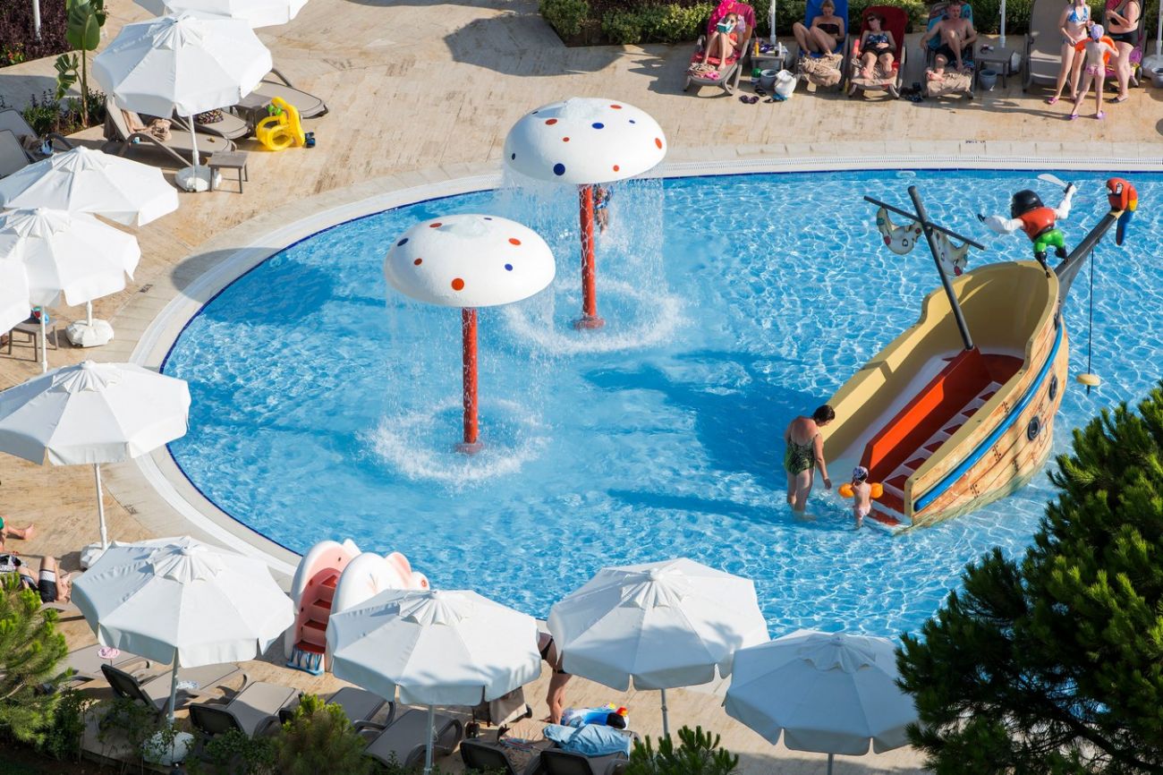 За децата: Детски открит и закрит басейн, 6 детски водни пързалки, мини клуб (4-12), детска площадка, детско меню, бебешка храна (по заявка), детска количка (платено), детегледачка (платено).