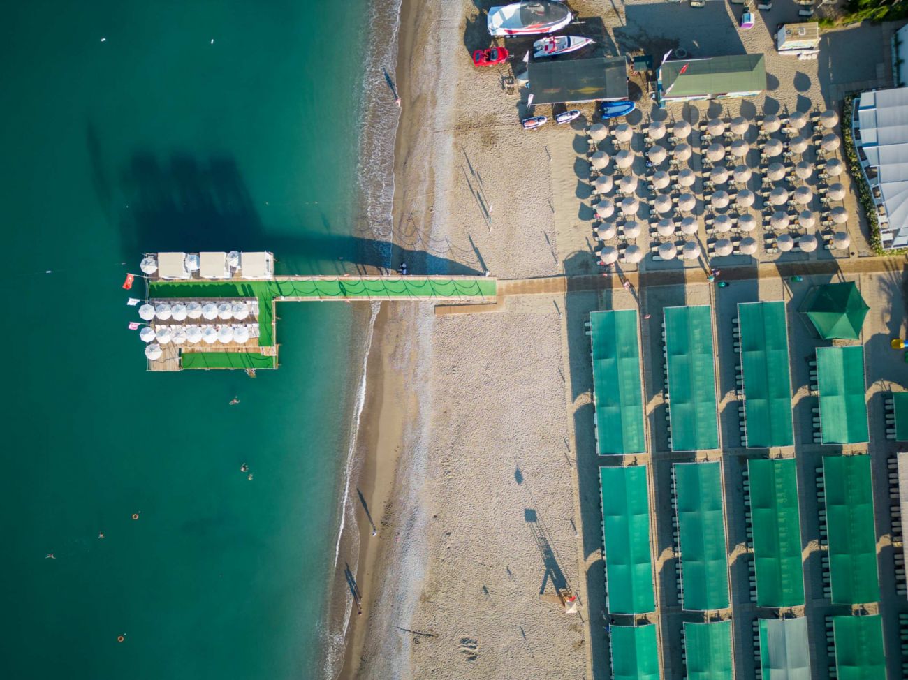 Собствен, пясъчно - чакълест. Чадъри, шезлонги и плажни кърпи на плажа и при басейна – безплатно.