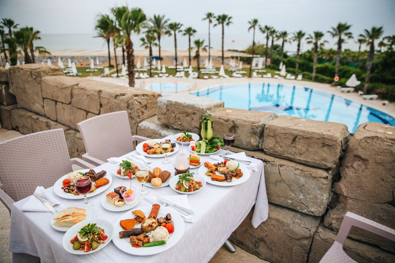 Основен ресторант, 3 а-ла карт ресторанта (турски, италиански и рибен), лоби бар, бар при басейна,открит басейн(376 кв.м.), закрит басейн (80кв.м.), тенис на корт, фитнес център, сауна, турска баня, масаж, салон за красота, анимация, СПА център, водни спортове За децата: детска площадка, 2 детски басейна, 3 водни пързалки, мини клуб (4-12г.), детско столче в ресторанта, детегледачка (срещу заплащане) Плаж: собствен. Чадъри, матраци и шезлоги на плажа и при басейна - безплатно.