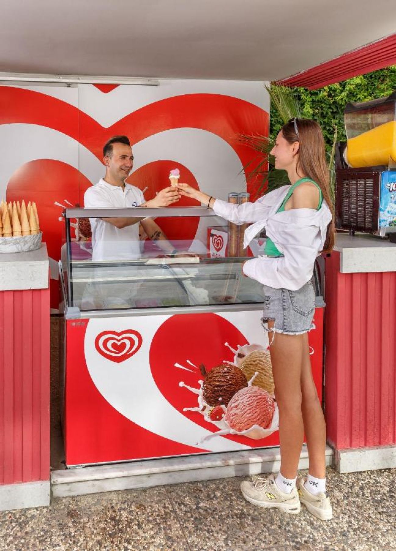 Собствен, пясъчно - чакълест. Чадъри, шезлонги и плажни кърпи на плажа и при басейна – безплатно.