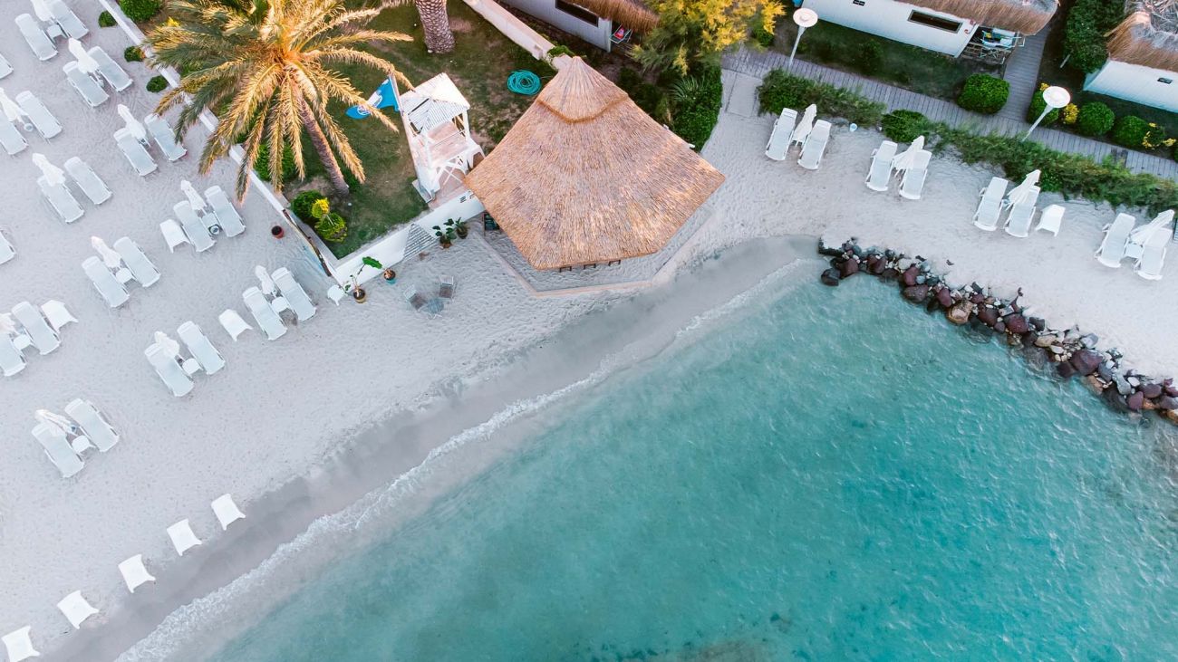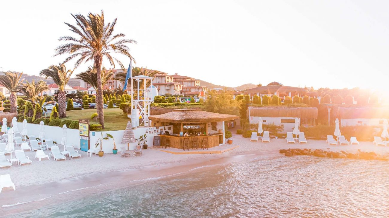 Собствен, пясъчен. Шезлонги и чадъри на плажа и при басейна - безплатно. Плажни кърпи - безплатно.